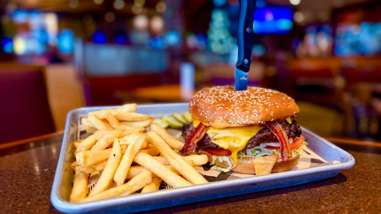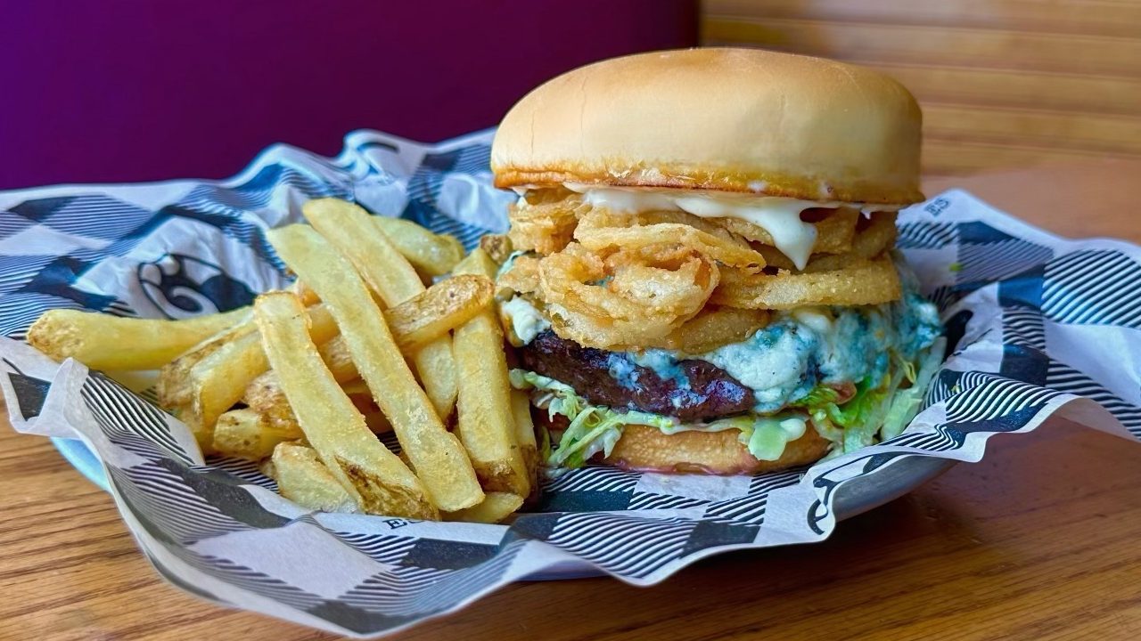 2025 Burger-Rama favorite! Seasoned *beef patty, smashed with onions and grilled, steakhouse aioli, arugula tossed in red wine vinaigrette, our house-made cheddar cheese sauce, bacon. $18.49