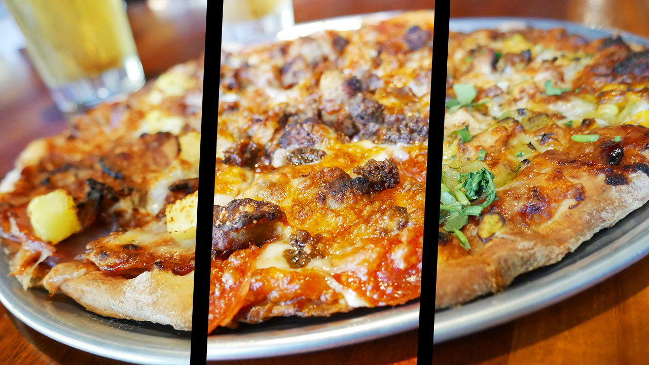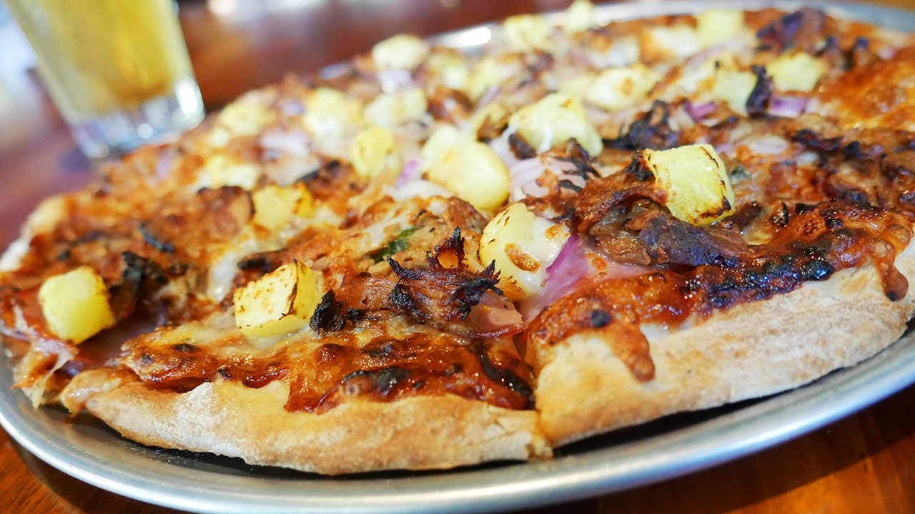 Ram BBQ sauce, fresh pineapple, pork carnitas, red onion, chopped bacon, and Canadian bacon. $19.99