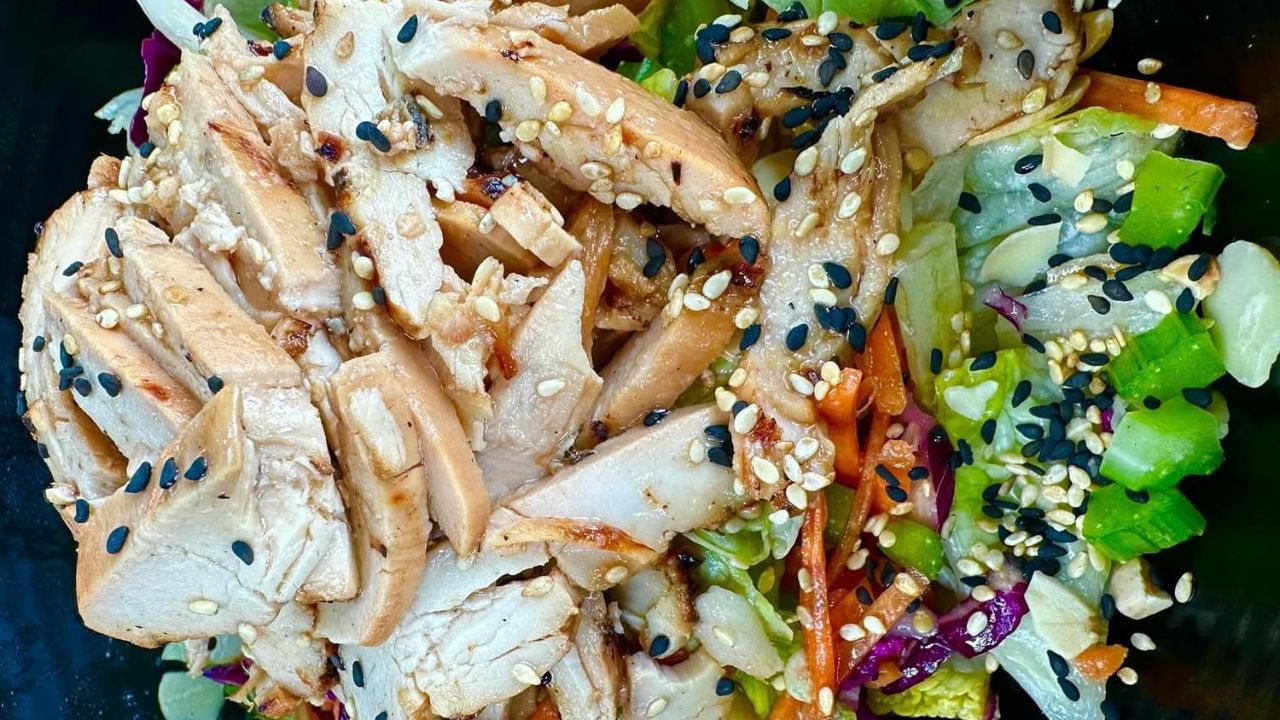 Teriyaki-ginger marinated chicken, grilled & chilled, served sliced over mixed greens, toasted slivered almonds, celery, finished with black & white sesame seeds, ginger dressing. $17.99