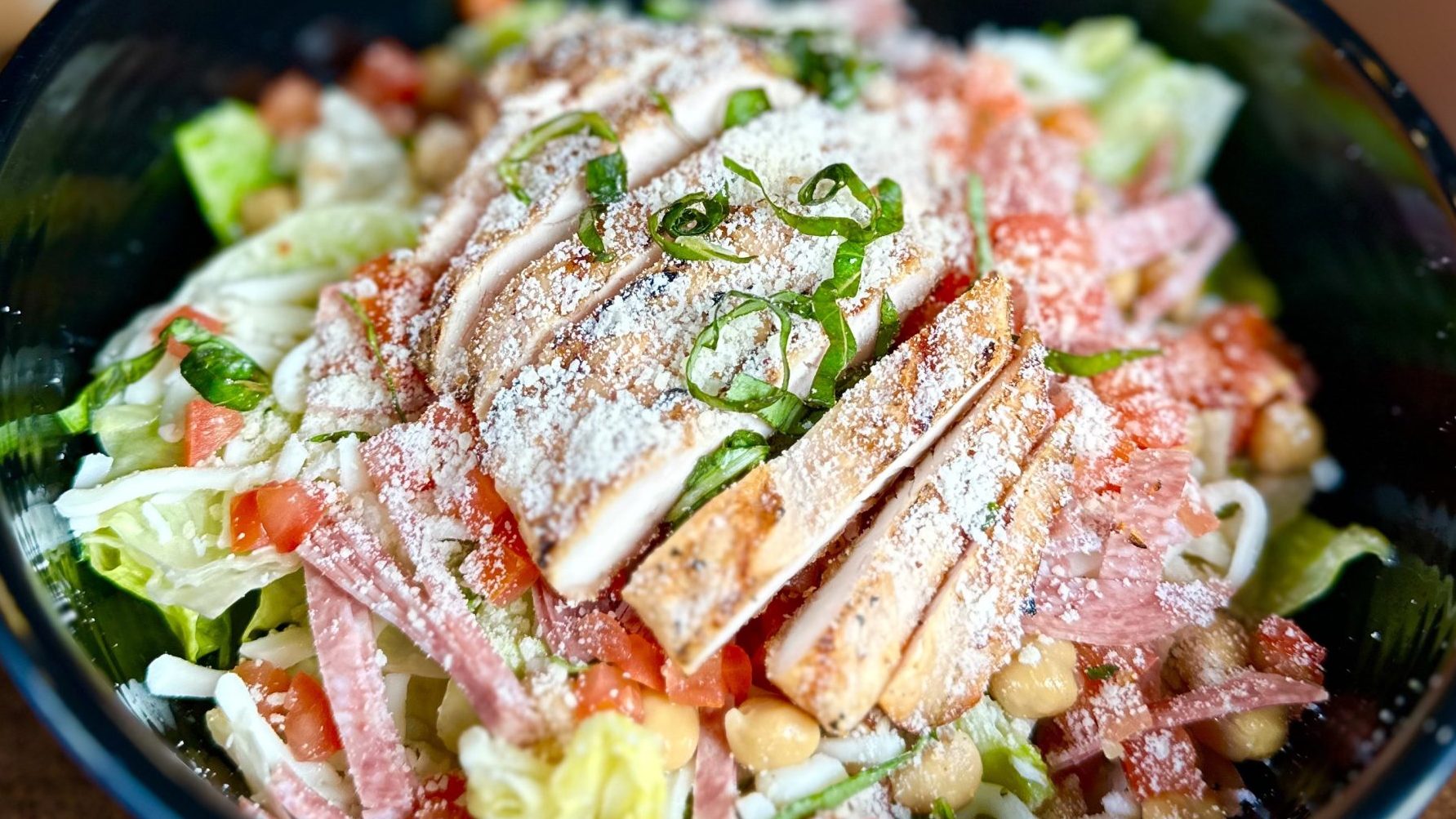 Iceberg, arugula, garbanzo beans, salami, diced tomato, tossed in red wine vinaigrette, mozzarella, diced grilled chicken, parmesan cheese, fresh basil. $16.99