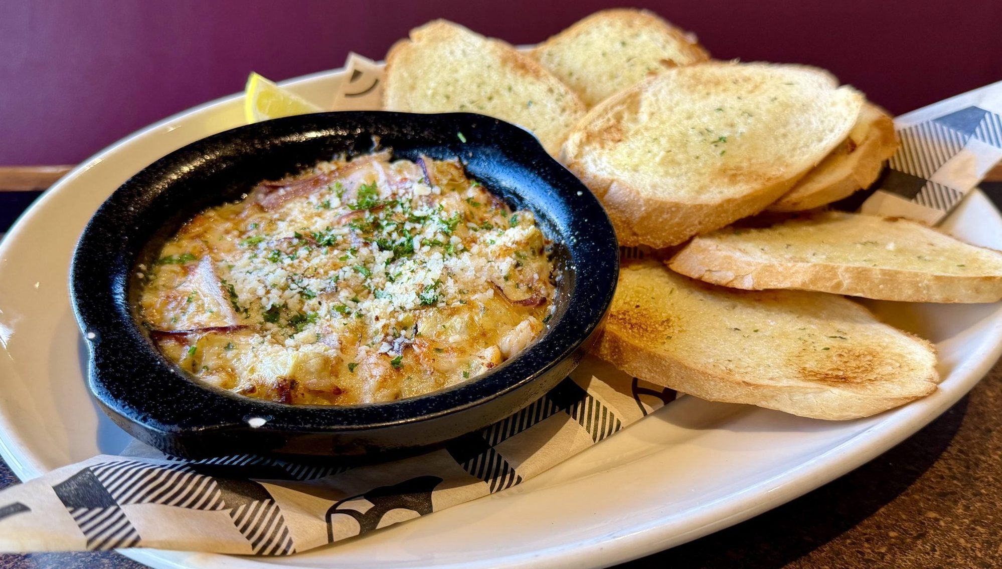 Pacific crab, Oregon bay shrimp, mixed with artichoke hearts, mayo, parmesan and red onion, oven roasted. Garlic buttered crostini. $17.99