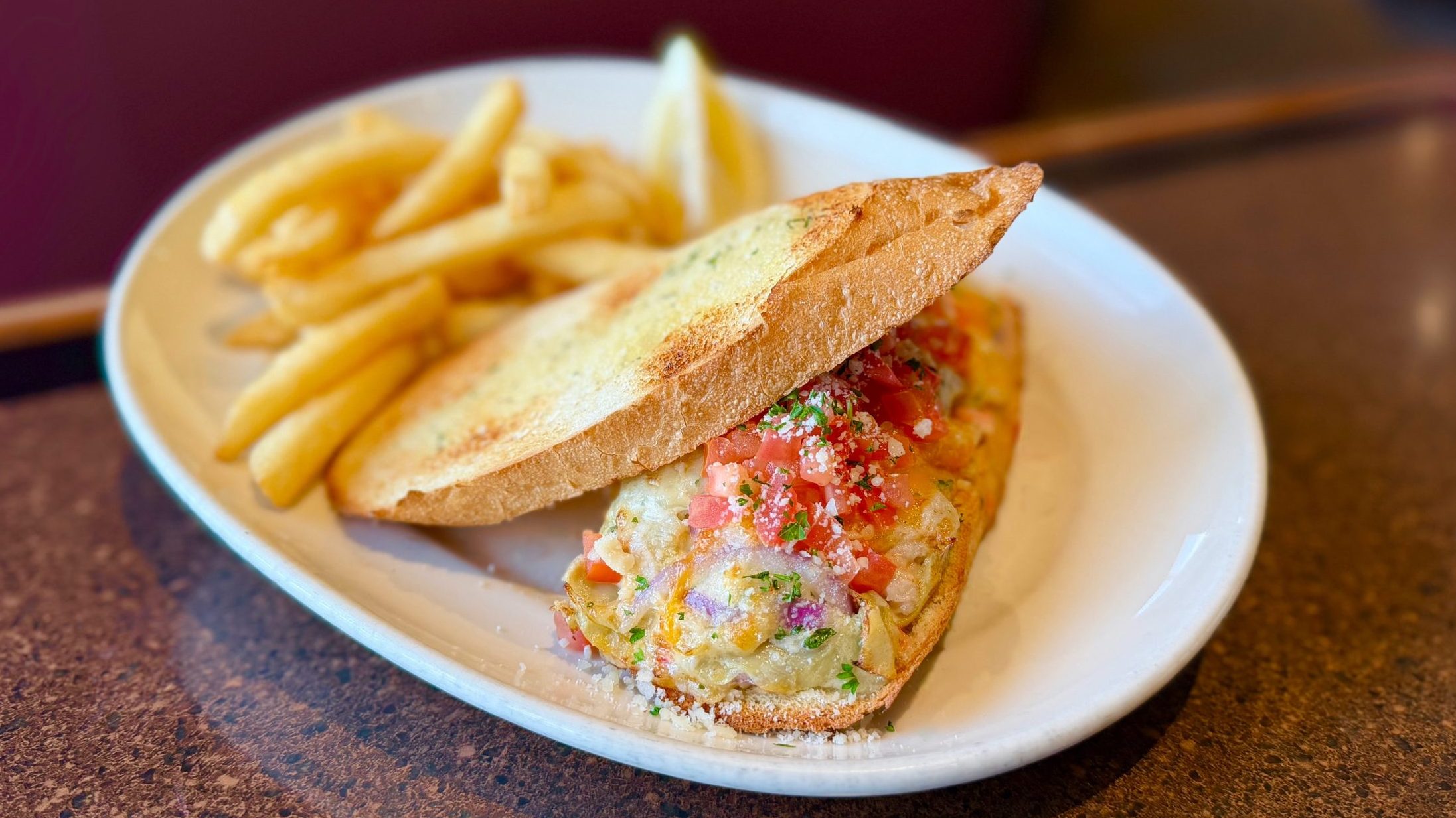 Crab, shrimp, and artichoke with parmesan, red onion, mayo, diced tomato, and cheddar jack. Served on a French baguette. $21.99