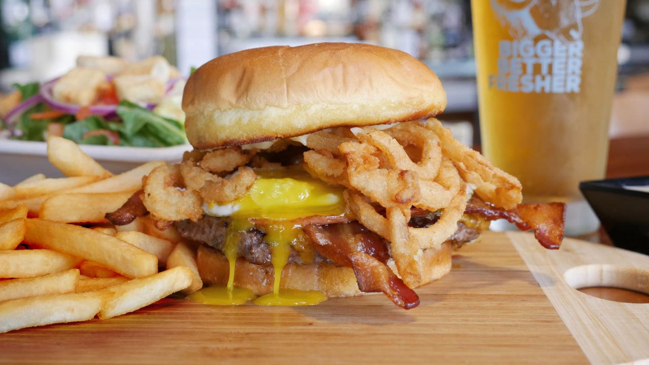 Wisconsin Cheddar, Canadian bacon, onion crisps, mayo, applewood-smoked bacon, fried egg.