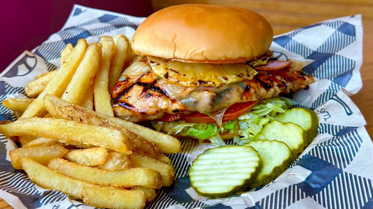 Grilled chicken breast, teriyaki sauce, Canadian bacon, pepper jack, pineapple crown, mayo, lettuce, tomato. $17.99