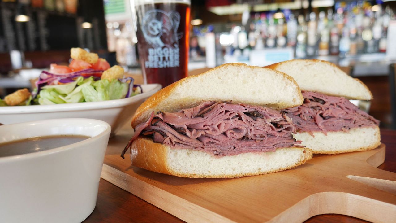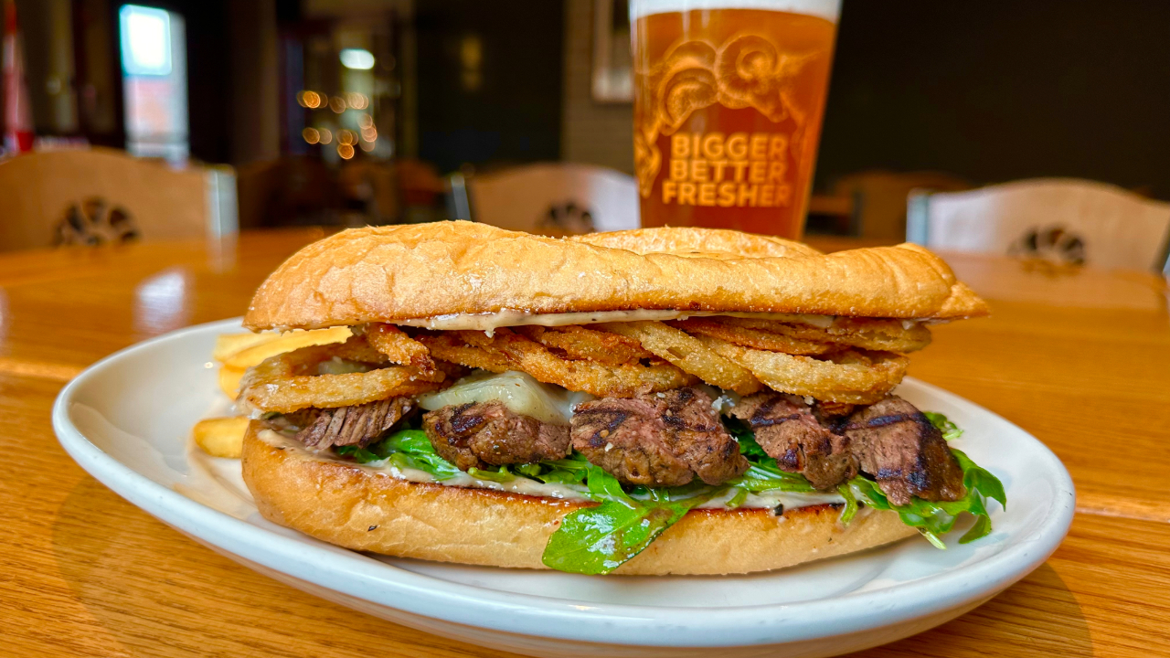 Buttface Amber Ale marinated sirloin, grilled, slice thin, steakhouse garlic aioli, havarti cheese, crispy onions, aged parmesan, arugula, red wine vinaigrette, grilled garlic baguette. Served with Au Jus. $22.99