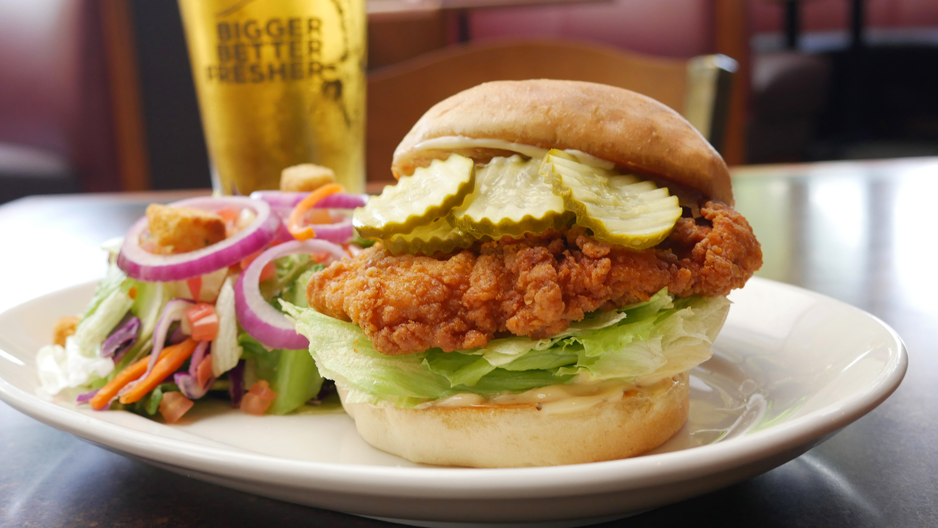 Buttermilk-battered, grilled bun, Dijon mayo, lettuce, dill pickles. $16.99