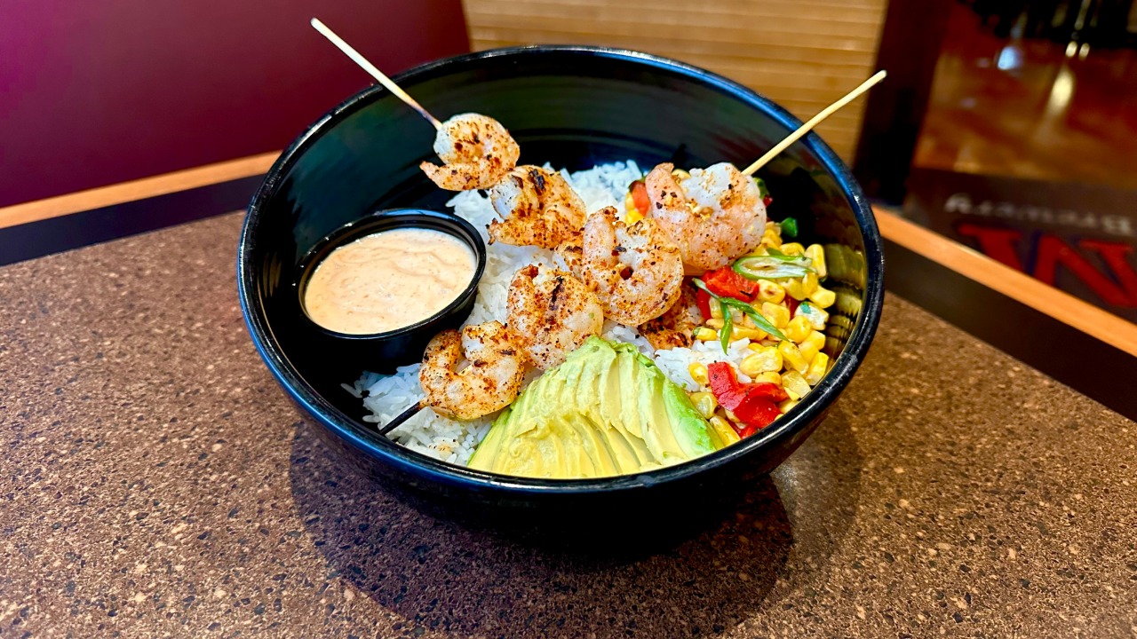 Corn salsa, avocado, jasmine rice, blackened prawns, yum yum sauce. $18.99