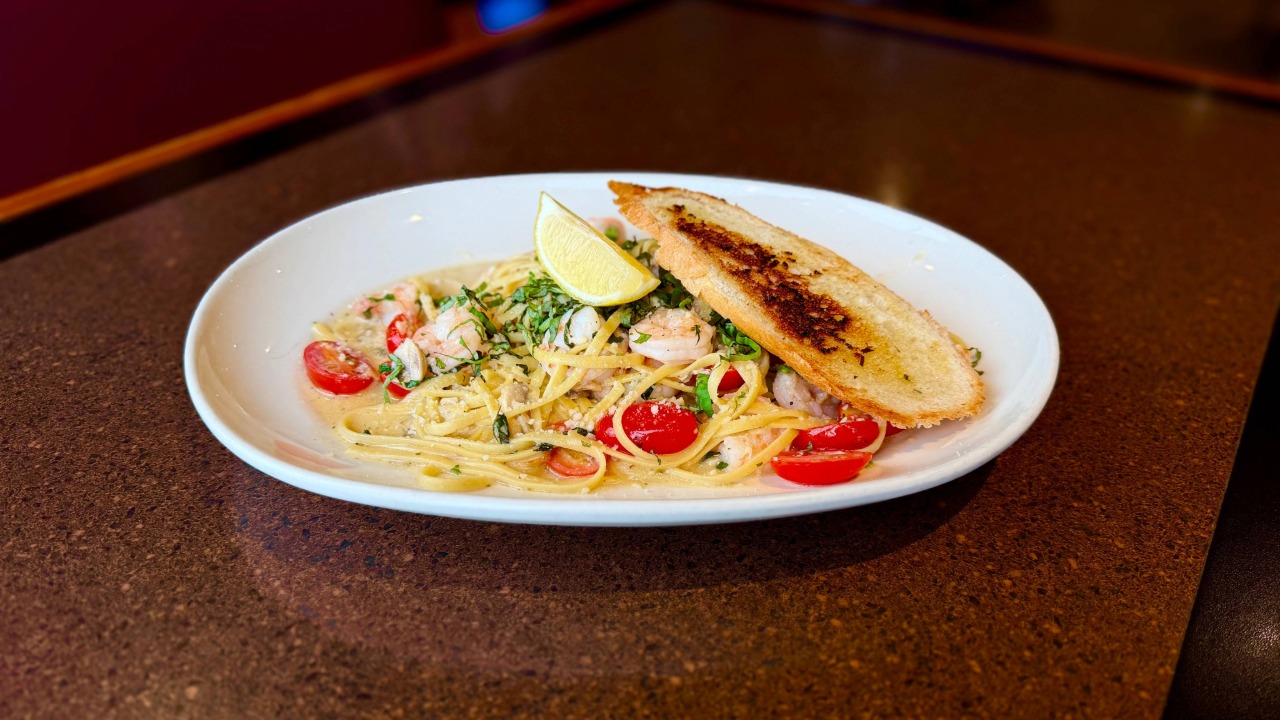 Linguine pasta, diced tomato, mushrooms, garlic wine butter sauce, roasted garlic, sautéed prawns. Served with toasted garlic bread. $24.99