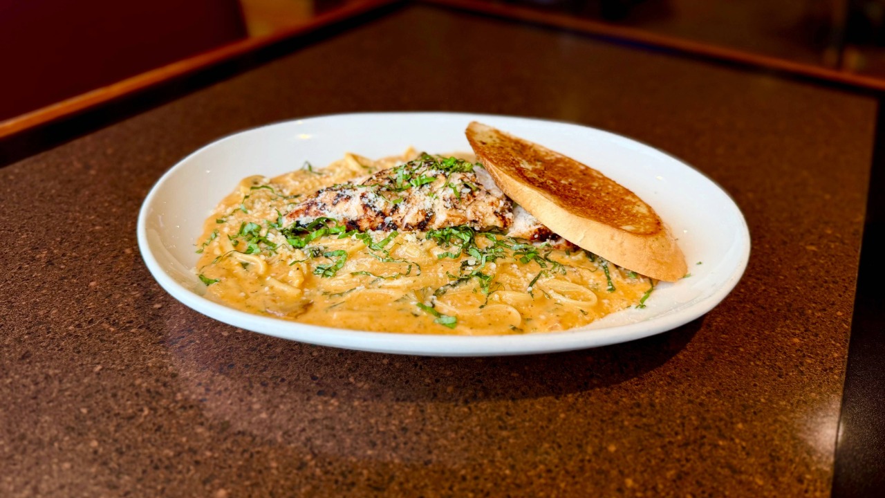 Linguine pasta topped with seared chicken, Tuscan mushroom cream sauce, and sundried tomatoes. Finished with parmesan and chopped basil. Served with toasted garlic bread. $23.99