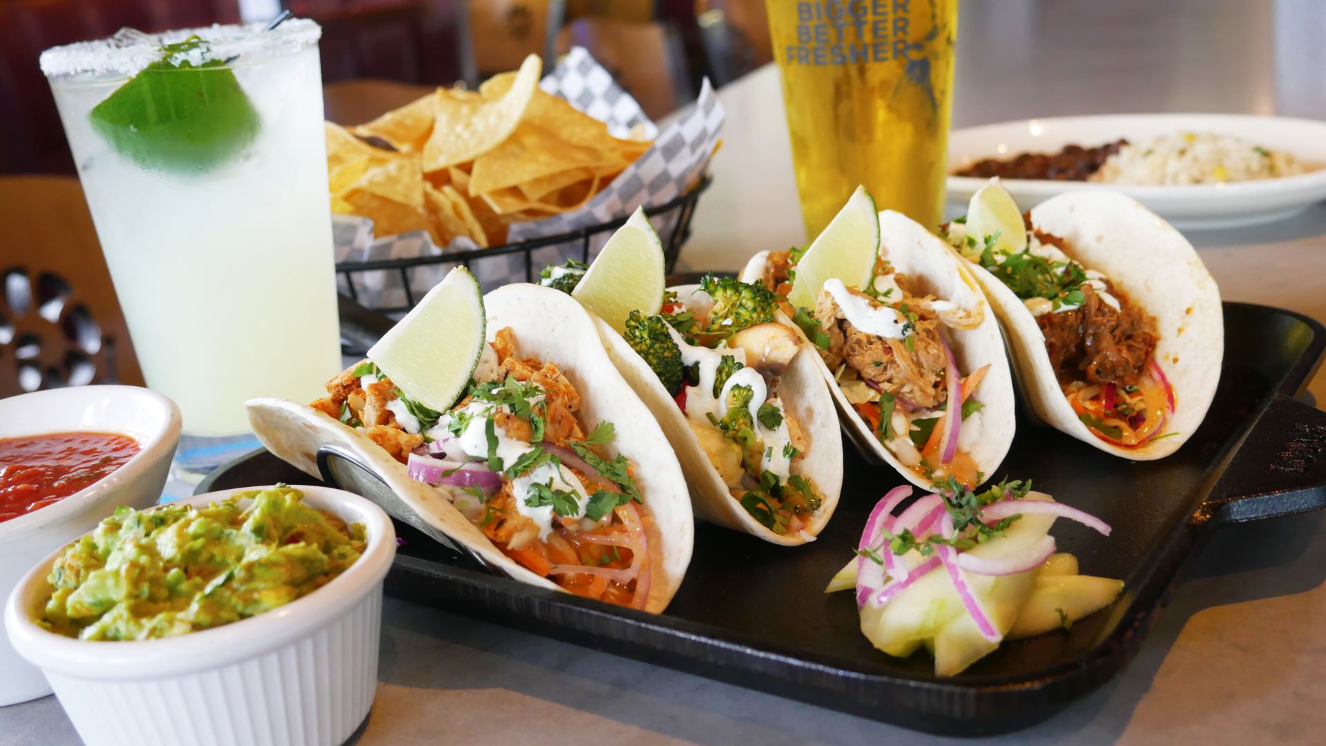 Add to your plate: cilantro lime rice & black beans $2, guacamole $4, chips & salsa $5