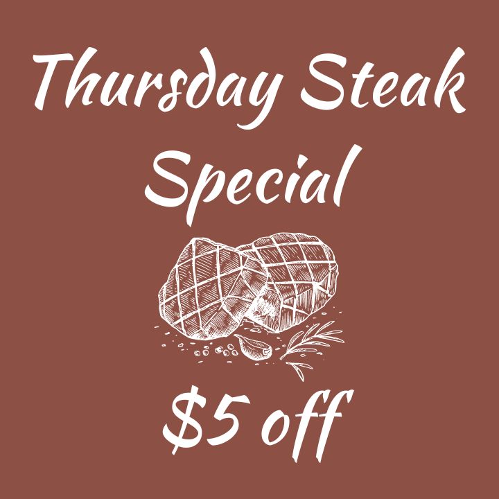 Every Thursday, get $5 off any steak! Includes our Sirloin, New York, and T-Bone.
