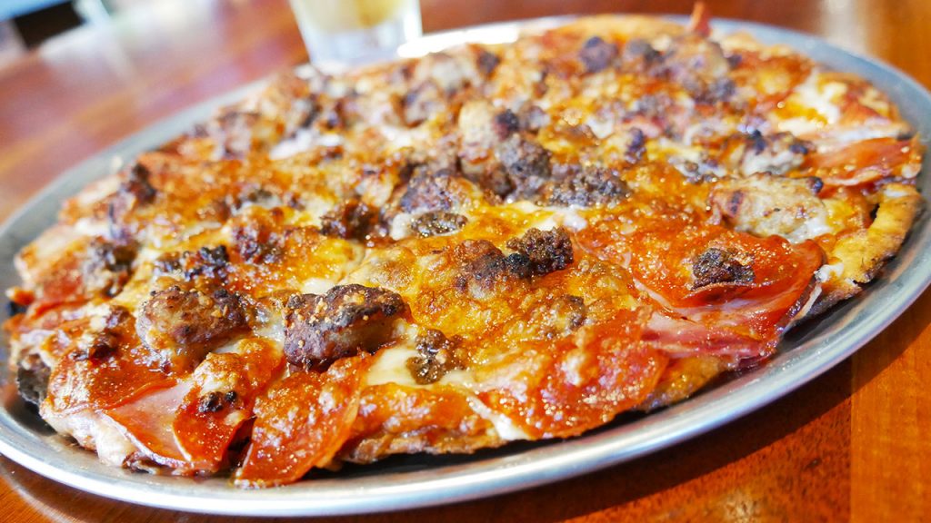 pepperoni, Italian sausage, Canadian bacon, mushrooms, black olives, and roasted bell peppers. $17.75