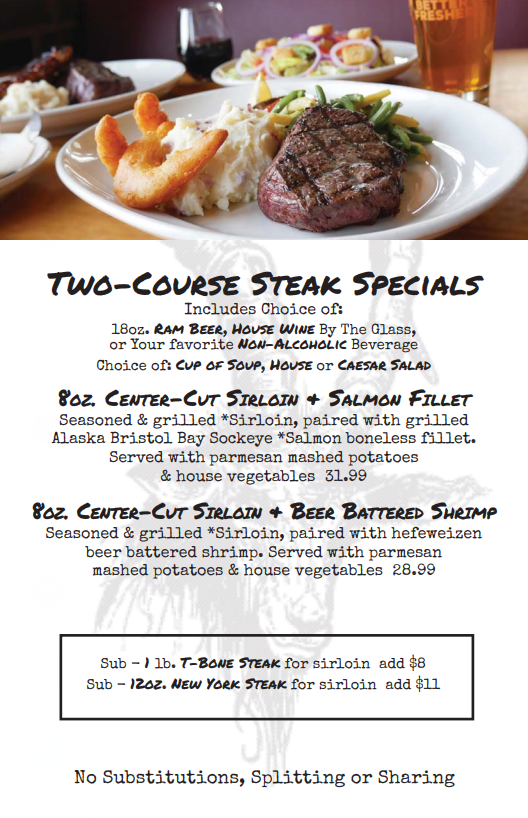 Celebrate Father’s Day with these limited-time steak features! Each entree selection comes with a soup or salad and your choice of an 18oz RAM beer, 6oz house wine, or non-alcoholic beverage.