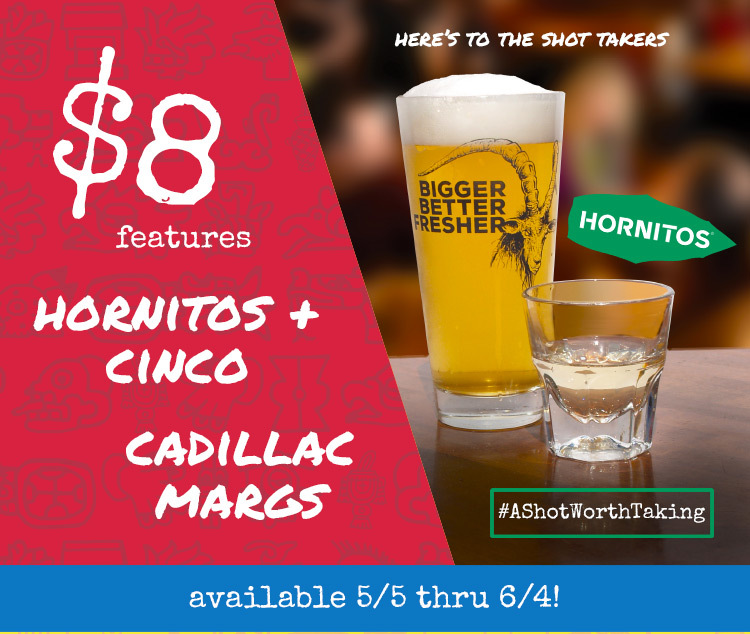Our $8 beer and a shot special is back. Get an 18 oz. pint of Cincopatas and a shot of Hornitos Tequila for just $8! Plus, get your hands on a delicious Cadillac margarita made with Hornitos Tequila for $8.